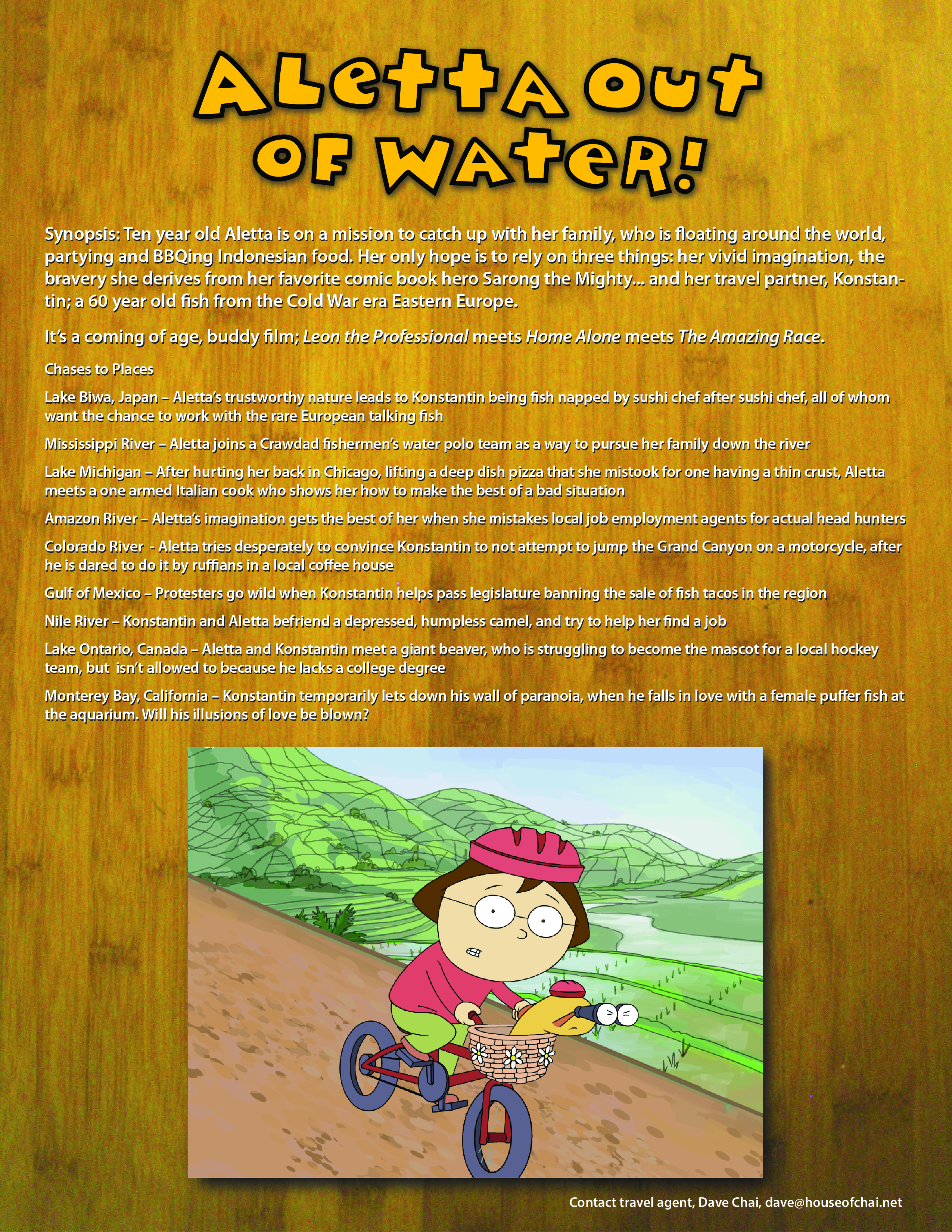 Synopsis: Ten year old Aletta is on a mission to catch up with her family, who is floating around the world, partying and BBQing Indonesian food. Her only hope is to rely on three things: her vivid imagination, the bravery she derives from her favorite comic book hero Sarong the Mighty, and her sometimes feisty temper. And also her travel partner, Konstantin; a 60 year old fish from the Cold War era Eastern Europe.
