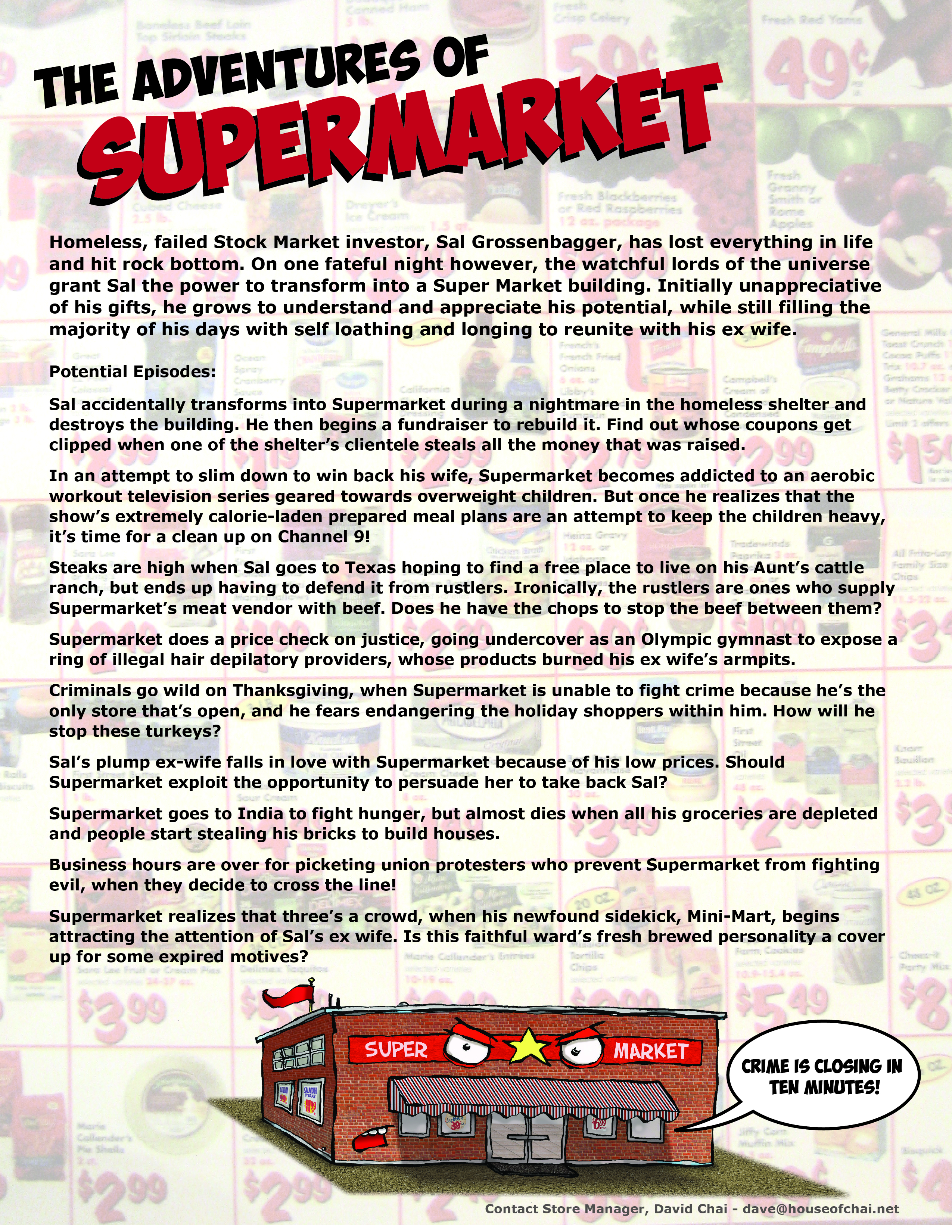 Synopsis: Homeless, failed Stock Market investor, Sal Grossenbagger, has lost everything in life and hit rock bottom. On one fateful night however, the watchful lords of the universe grant Sal the power to transform into a Super Market building. Initially unappreciative of his gifts, he grows to understand and appreciate his potential, while still filling the majority of his days with self-loathing and long to reunite with his ex-wife.